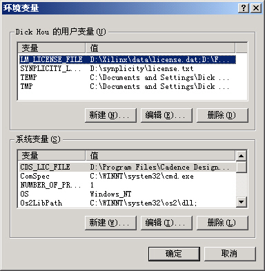 列在上面的是用户变量,下面的是环境变量,建议在用户变量栏设置较好。栏内有两项,一项是变量,一项是值。可以看到它只是将win98下的格式中的set 和 =去掉了,其它并没有不同:在变量栏中填入变量名称,如LM_LICENSE_FILE、SYNPLICITY_LICENSE_FILE,再在值一栏中输入完整路径和license文件名就搞定了!如果EDA软件在安装时没有生成设置变量栏,则可以点击新建按钮,按照上述格式输入就行了。